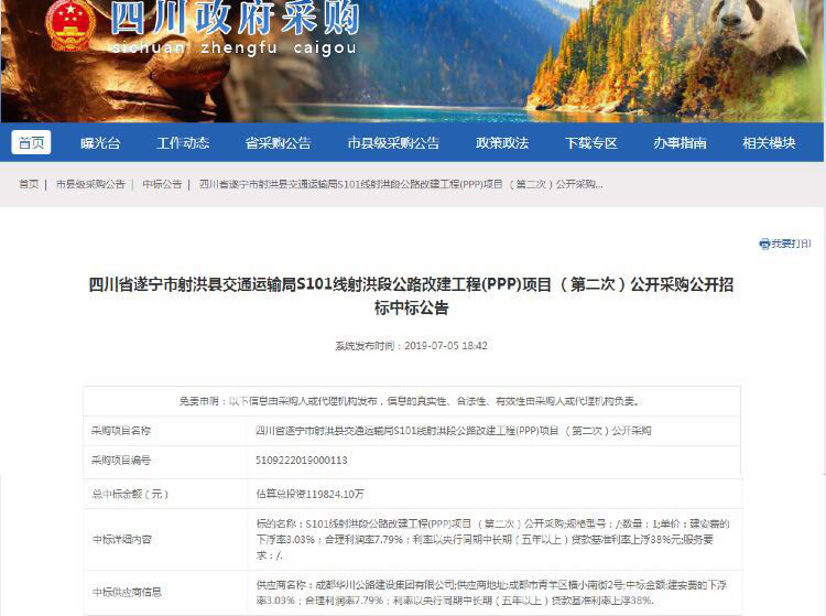 近日,集團(tuán)成功中標(biāo)四川省S101線射洪段公路改建工程(PPP)項(xiàng)目。7月5日,四川政府采購(gòu)網(wǎng)正式發(fā)布中標(biāo)公告。