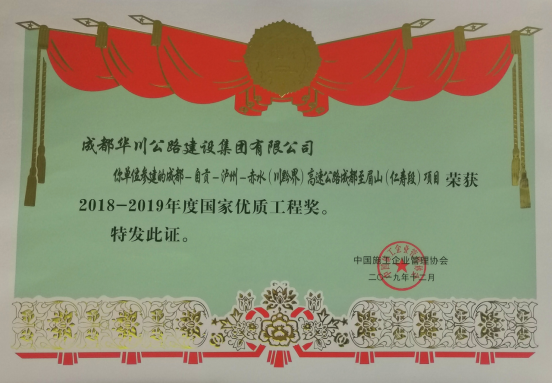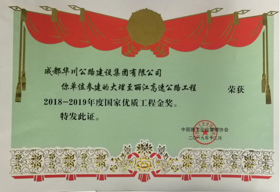 集團在2018年組織申報的“大理-麗江高速公路”、“成都-自貢-瀘州-赤水高速成仁段”項目于今年12月分別榮獲“國家優(yōu)質工程金獎”、“國家優(yōu)質工程獎”兩項殊榮,實現(xiàn)了集團參建工程在國家優(yōu)質工程(金)獎上的突破。此次獎項由集團總工辦全力申報。